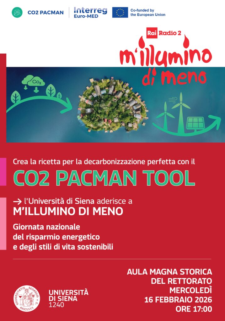 On February 16, at 5 p.m., in the historic Aula Magna of the Rectorate (Banchi di Sotto, 55 – Siena), a meeting entitled “Create the recipe for perfect decarbonization with the CO2 PACMAN Tool” will be held as part of “M’Illumino di Meno,” the National Day of Energy Saving and Sustainable Lifestyles. Faced with the challenges of climate transition, for two years, the CO2 PACMAN project, funded by the Interreg Euro-MED program, has been proposing an approach that integrates scientific knowledge and the direct involvement of local communities. The project involves the participation of 10 European partners from 7 different countries. Professor Simone Bastianoni, Rector’s delegate and scientific coordinator of the project, together with his collaborators, will present software that allows everyone (politicians and citizens alike) to create their own “recipe” for decarbonization: a clear and concrete path to understanding what it means to decarbonize a territory, which individual and collective policy choices are most effective and can make this goal realistic and shared. During the CO2 PACMAN project, applied to the Mediterranean islands, local data on greenhouse gas emissions were collected and analyzed in the three pilot islands of Brač (Croatia), Crete (Greece), and Elba (Italy). This initial phase allowed for the creation of a knowledge base on the main emission sources related to energy, mobility, buildings, and resource use. Based on this evidence, the CO2 PACMAN Tool was developed, a scientific tool that translates the data collected into clear and immediate visual scenarios that are understandable even to non-experts. Through the CO2 PACMAN Tool, Prof. Bastianoni and his research team will show how different policies and behaviors can affect emissions: citizens will be able to visualize the effects of individual and political choices, comparing possible alternatives and creating a shared “recipe” for decarbonization. The goal is to move from knowledge to action, making scientific evidence accessible and promoting informed and shared decisions. In the CO2 PACMAN project, decarbonization is conceived as a participatory process that values the role of citizens alongside that of institutions. The CO2 PACMAN Tool, designed for a wide audience, thus becomes a tool capable of promoting dialogue between science and the community, useful for imagining and building together “the island we would like,” in a shared journey toward climate neutrality.